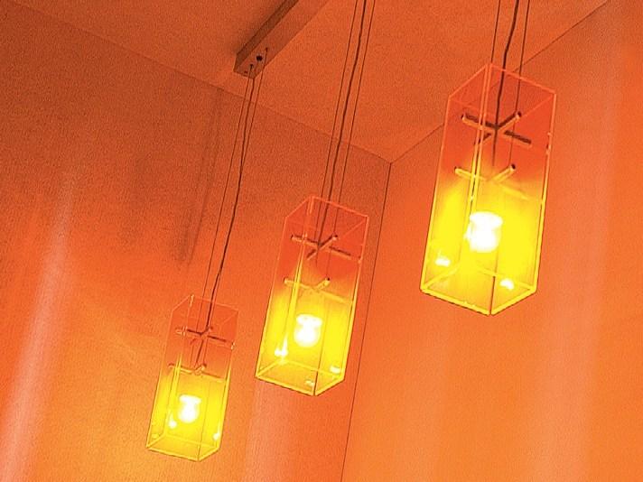 Bridge is a light-box that diffuses light trough coloured Perspex panels. The open edges emphasise the shape of this airy light design. The slender aluminium “meccano”-like frame is fixed with thin metal cables. Colours are red transparent, blue transparent, green transparent and surprisingly mokka transparent.