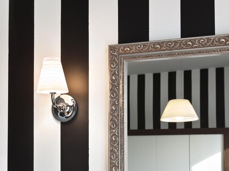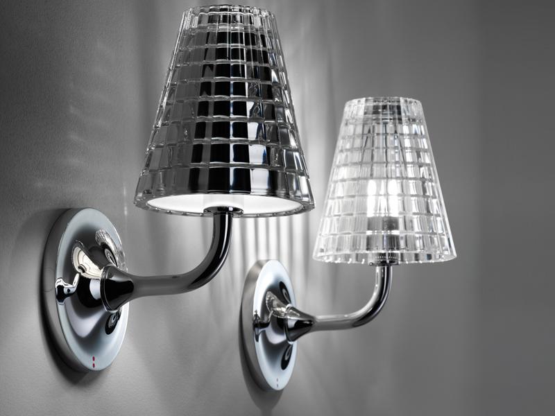 technical info: - Gost R EAC: The product is in conformity with the requirements laid down by the russian standards. - Protected against entry of solid objects larger than 12 mm. No protection against the ingress of water. The collection is made up of hanging, table, floor, wall and ceiling lamps for indoor use. The crystal diffusers are available with different diameters (12-35-45 cm), either transparent or painted on the inside. The metal supports are in polished chrome. The lamp runs on mains power and is suitable for use with halogen bulbs.