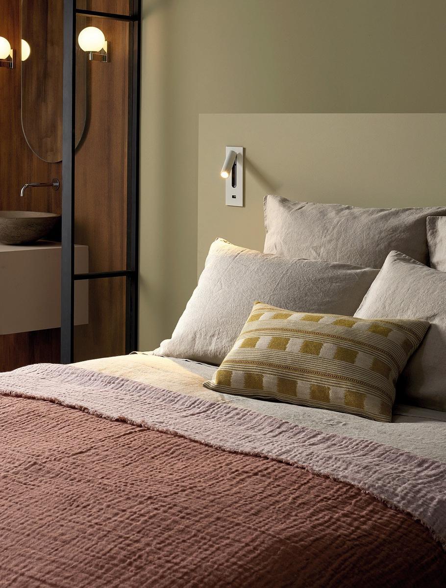 Fuse is a plastic LED reading lamp with USB. Finishes: bronze (1215085), matt black (1215082), matt gold (1215103), matt nickel (1215084), matt white (1215081), polished chrome (1215083) Uses a 2W 2700K LED. IP20 rated. Class I - Earth. 7.5 x 9.2 x H. 20 cm