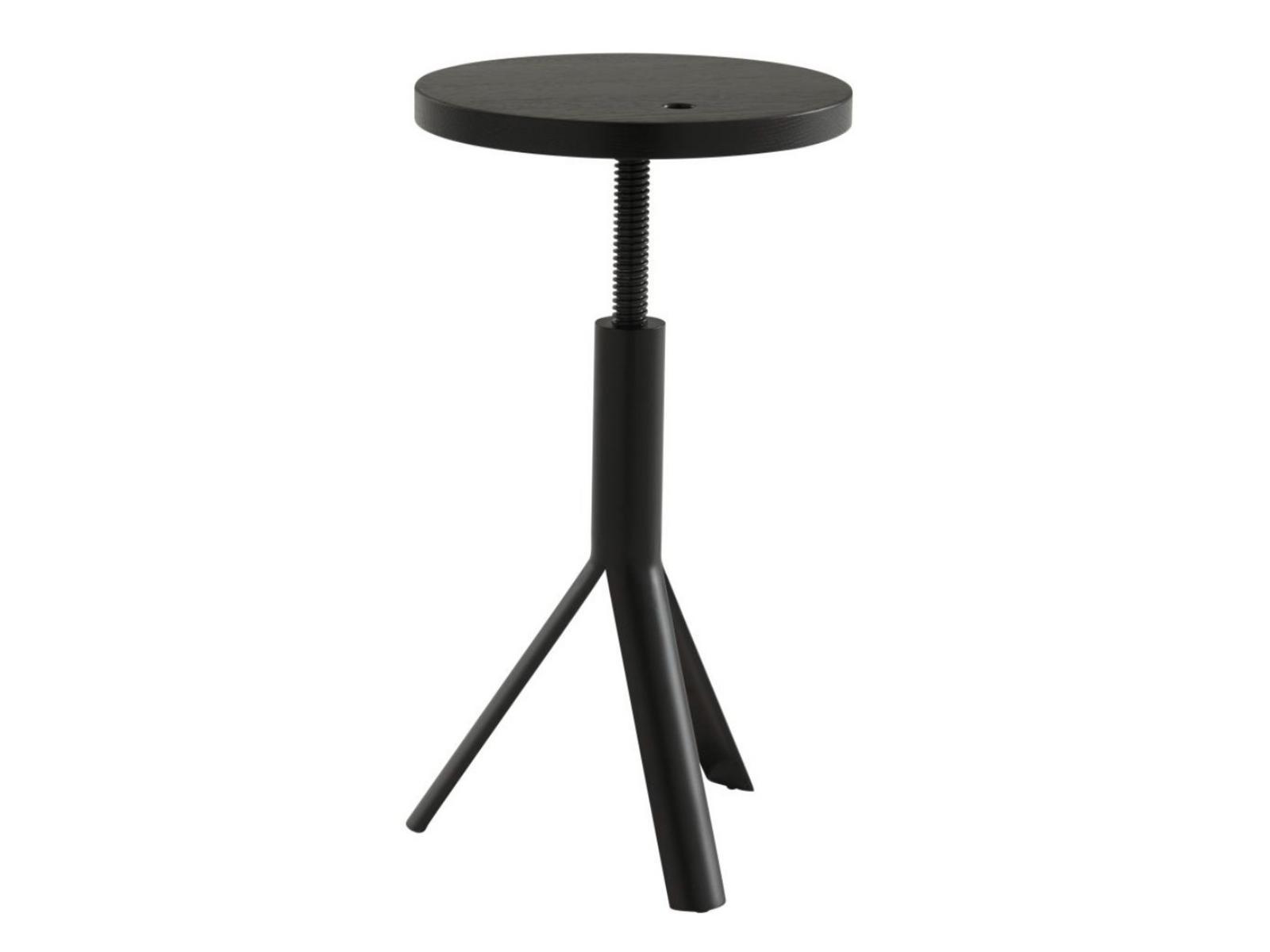 The IKE turn stool stands on three legs. The steel cylindrical help for the string of the unending screw parts into three to shape the three legs. Height-adjustable turn stool. Seat in 20 mm normal stained solid oak with thumbhole (for both simplicity of control and to help with changing the height somewhere in the range of 41 and 55 cm). Screw support and interminable screw in zinc-covered metal. Base in white lacquered steel. Protective gliders. Ø 30cm H 41cm