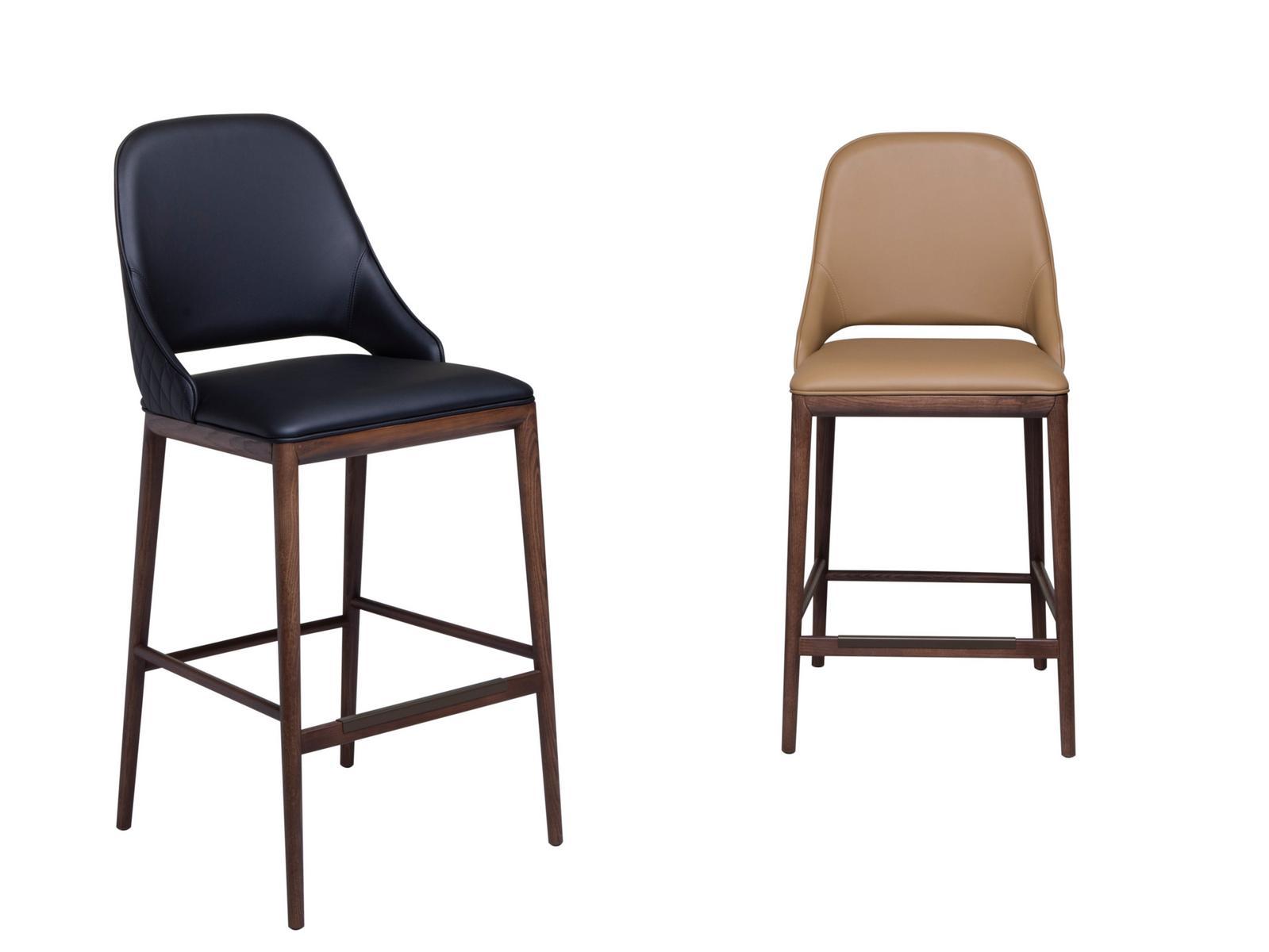 Malva Élite is a high stool with wooden base in Canaletto Walnut finish and upholstered seat covered in black leather. The Malva seat is proposed in a stool version, unique and elegant: the defined lines, the curved armrests and the slender base give a strong identity to the living space. In the Elite version, Malva is enriched with the exclusive diamond quilting on the back.