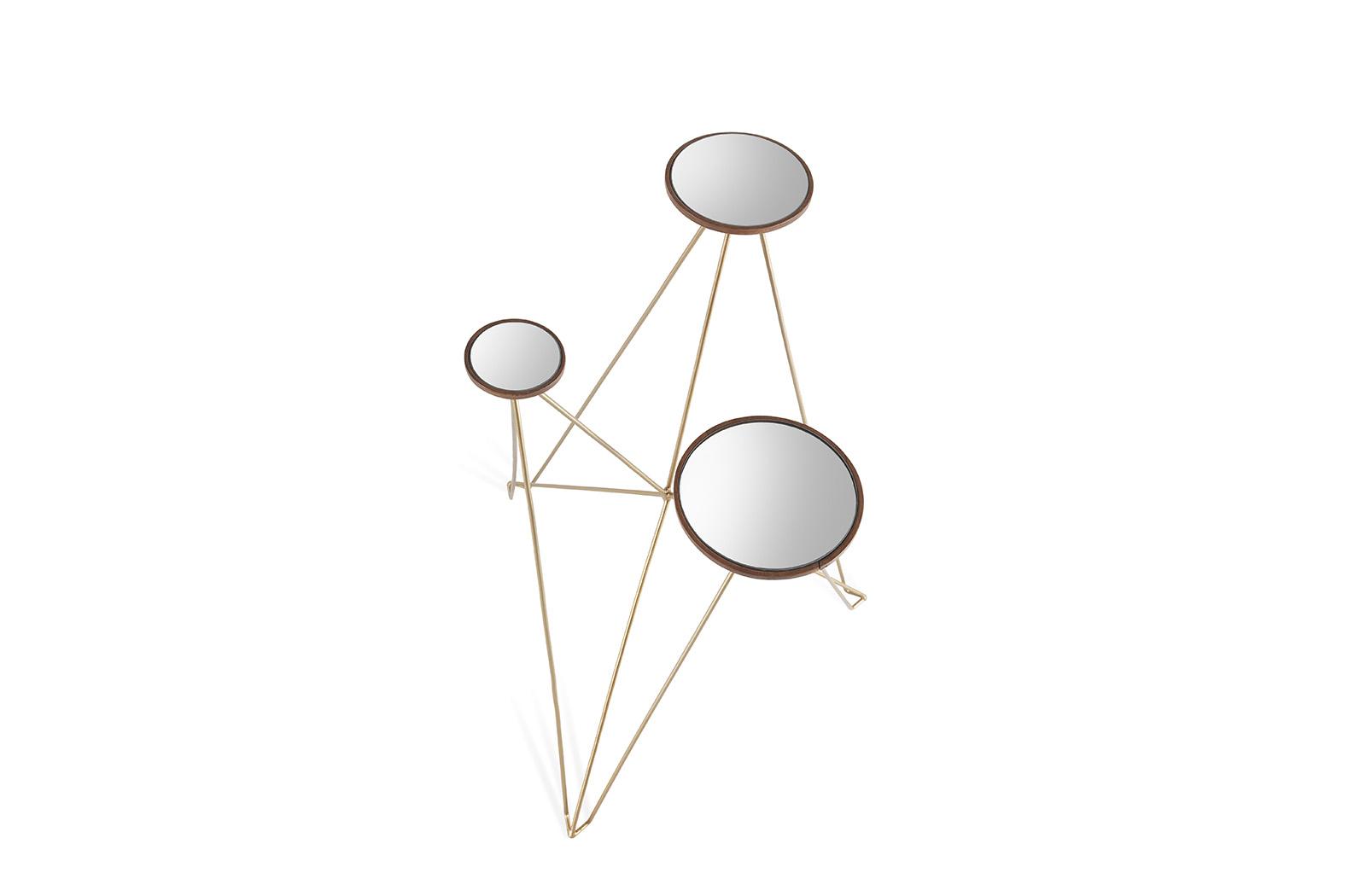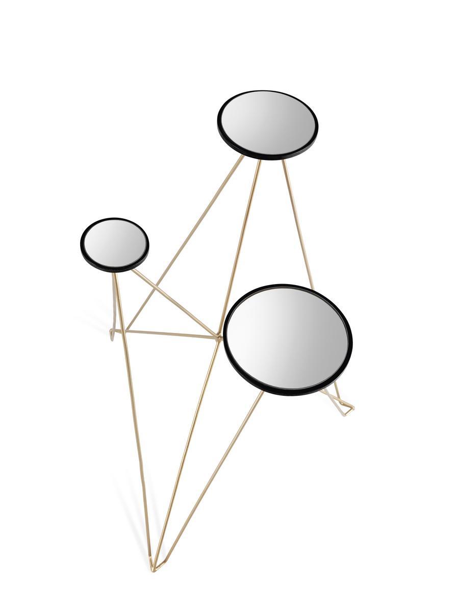 Construction in metal with tanned finishing. Shelves in dark lacquered wood and smoky mirror. 59 x 62 x 78 cm
