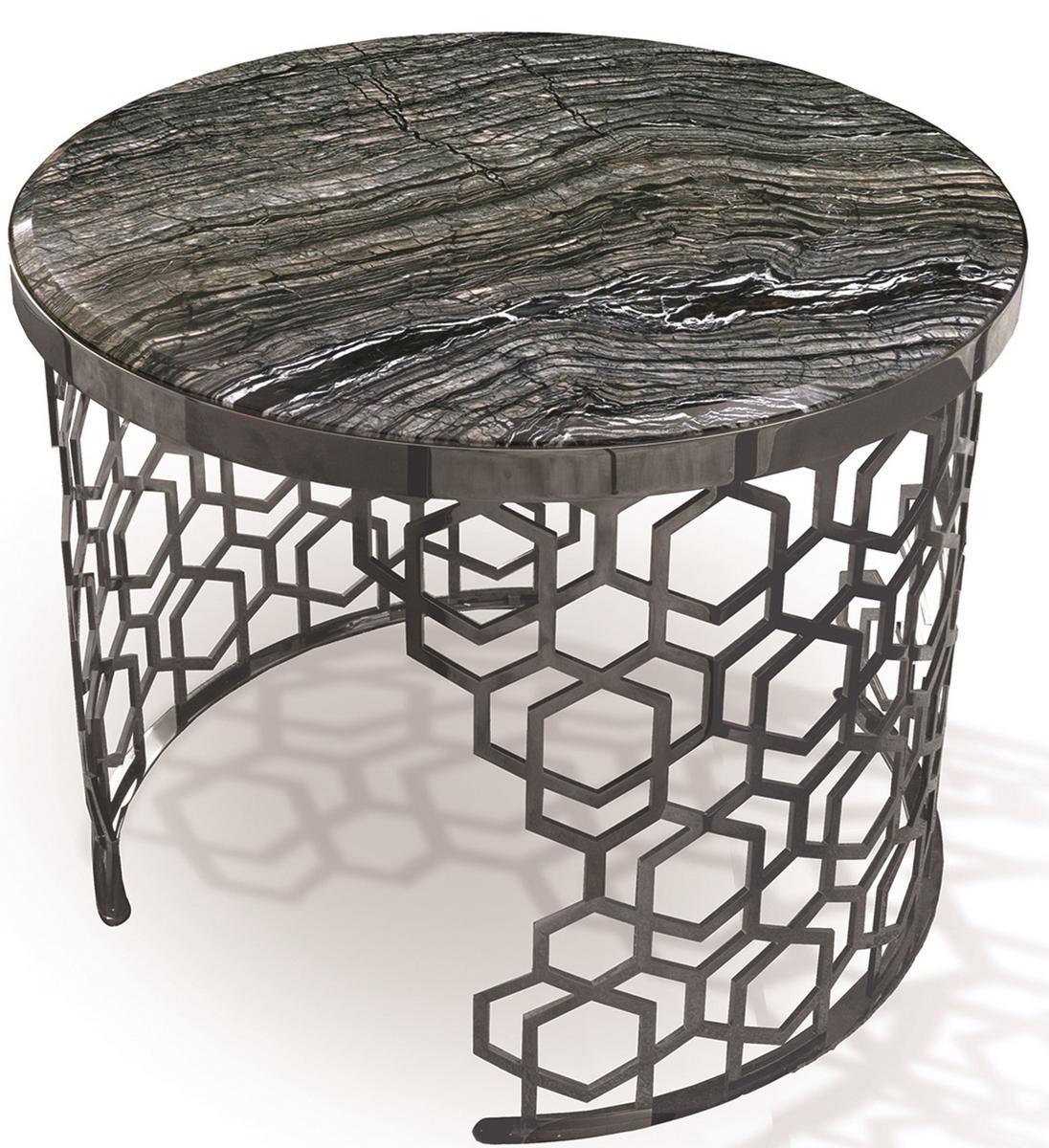 The table's metal base, combined with natural stone, makes it a unique and impressive piece of furniture. The base, with its central leg, is made from ground laser-cut metal with a curved Sequence decoration, which gives Manfred a luxurious and elegant appearance. You can choose from six finish options that include bright light gold, champagne gold, bright chrome, bright black chrome, matt satin bronze, or bright pink gold, depending on your taste.