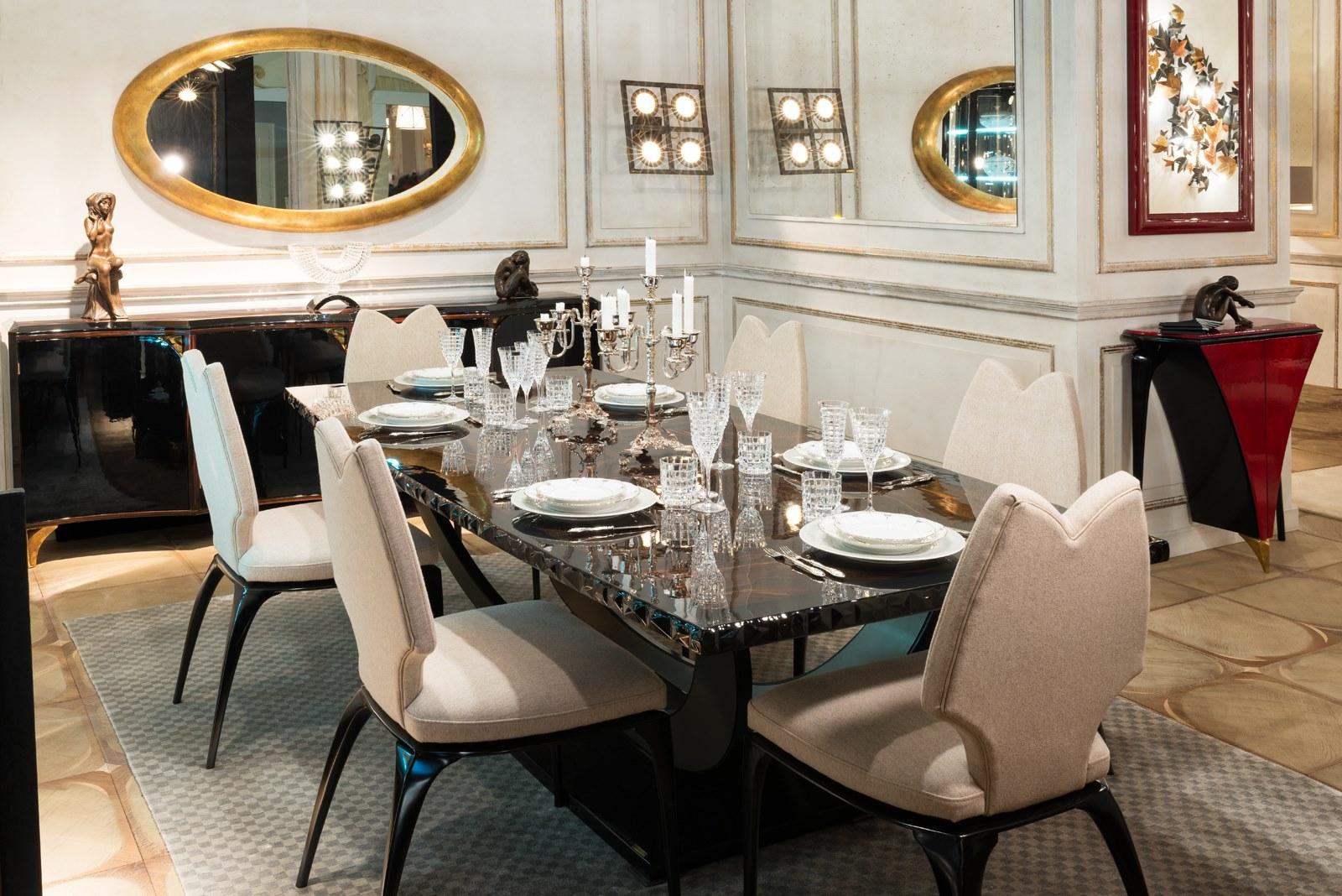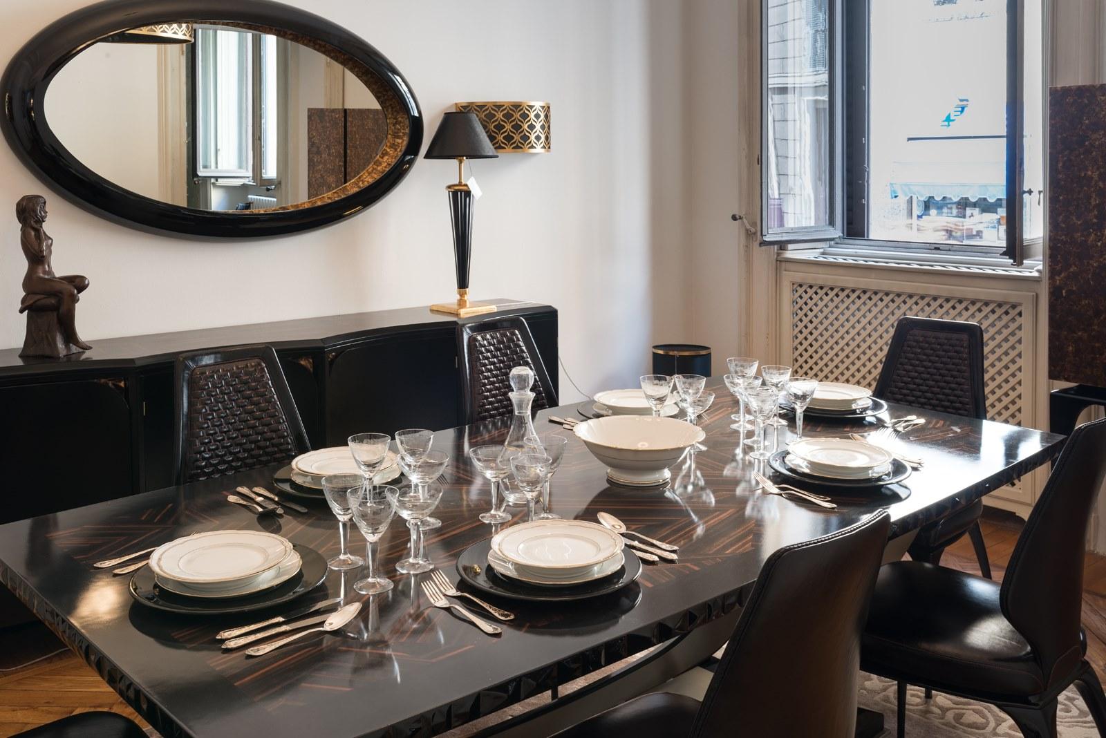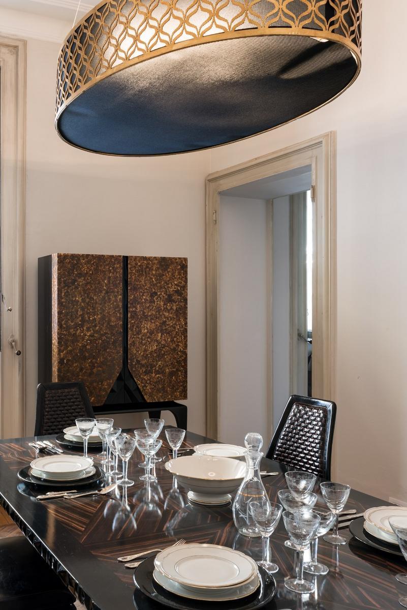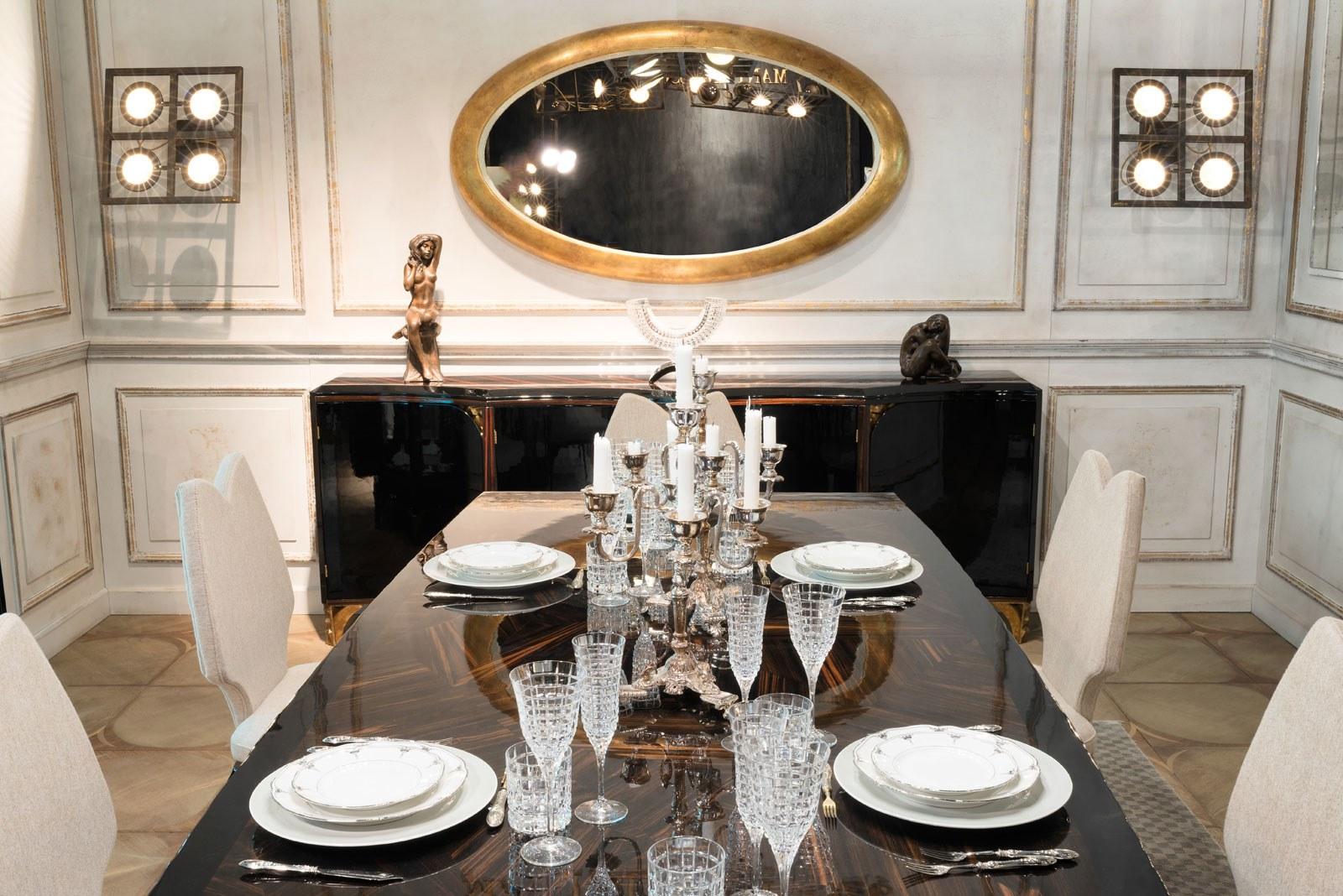 Pontecorvo is a table with reflect finished veneered top and 3D faceted strong wood edge, base with curved legs in wood and painted steel. Finish in Macassar black and semi-gleam covering for an amazing touch effect. The trimmed subtleties in rosewood are hand tailored by Tuscan cabinetmakers in the center. The gondola base in a blend of steel and wood invigorates and elegance. This uncommon piece consolidates recent fads in plan and engineering, while always remembering the rich custom of the past. The twofold character of this table is perfectly joined, the Decò meets contemporary lines, while mirroring Mantellassi's way of thinking of testing the past through the future. Pontecorvo is a series formed by dining table and chair. Both in the items and in the last little details, in present day and semi-sparkle tones, Cosmopolitan assortment, reviewed at the 2019 Edition of the Milan International Furniture Fair and planned by Nicola and Roberta Mantellassi, uncovers an incredible regard for assembling and care of subtleties, the consequence of an outrageous assembling preciousness. An assortment which proposes a contemporary and cosmopolitan style, a returned to and amended déco, which deciphers extravagance in its most ebb and flow implications bringing it towards a maximalist contemporary. Recalling the design of the significant world cities, Cosmopolitan is the aftereffect of an exploration organized, circumspect and clashing, in the refined match of materials, in the provocative new translation of the lines, where the enhancement is work just as prestige. H 76 D 120 W 260 cm , H 30 D 47 W 102 in